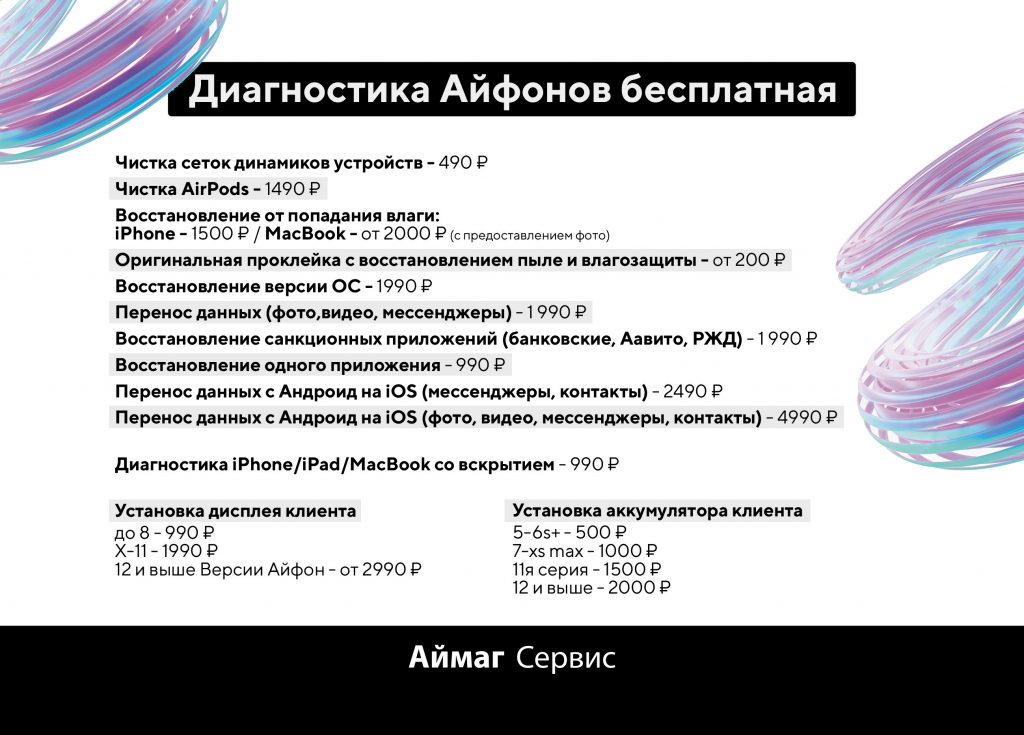 - Диагностика устройства, в случае отказа от ремонта 1000₽